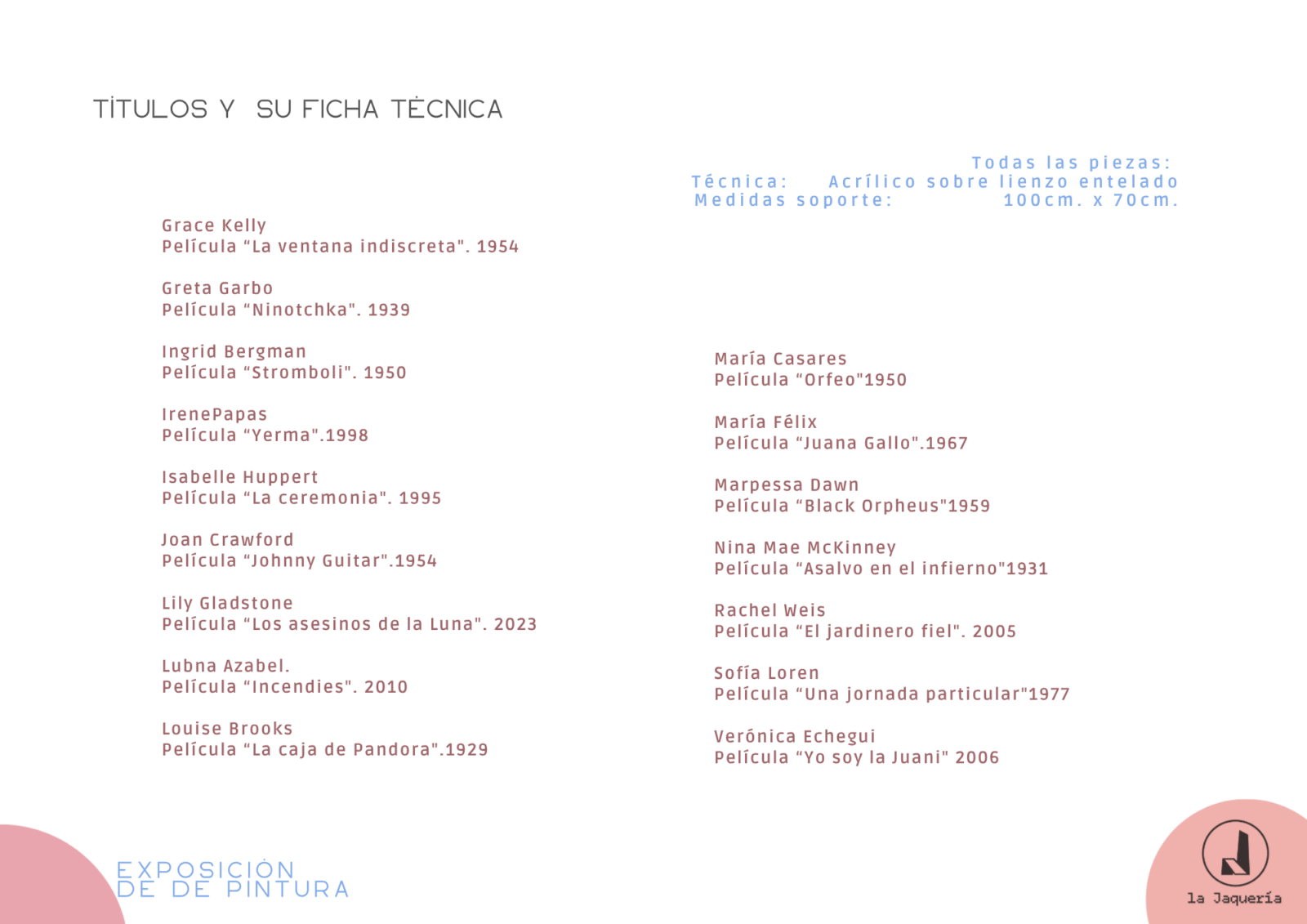 Artificio, realidad, veracidad o verdad…, no tienen aquí cabida, salvo en el referente, repito. Porque Heva no busca calcar, copiar o reproducir la imagen perfecta, icónica, de estas actrices tan populares, Divas, muchas de ellas, en su tiempo y actualmente (eternamente, con toda seguridad para amantes de lo cinematográfico)…, no lo necesita, y hoy día no es necesario… No se trata de ver cuánto se parecen a la actriz en la que se basó para el retrato, aunque el nombre de la película aparece, pero es con motivo de compartirlas…, de unir experiencias cinematográfica remitiéndonos a esa película en concreto que a ella le ha motivado a pintar…