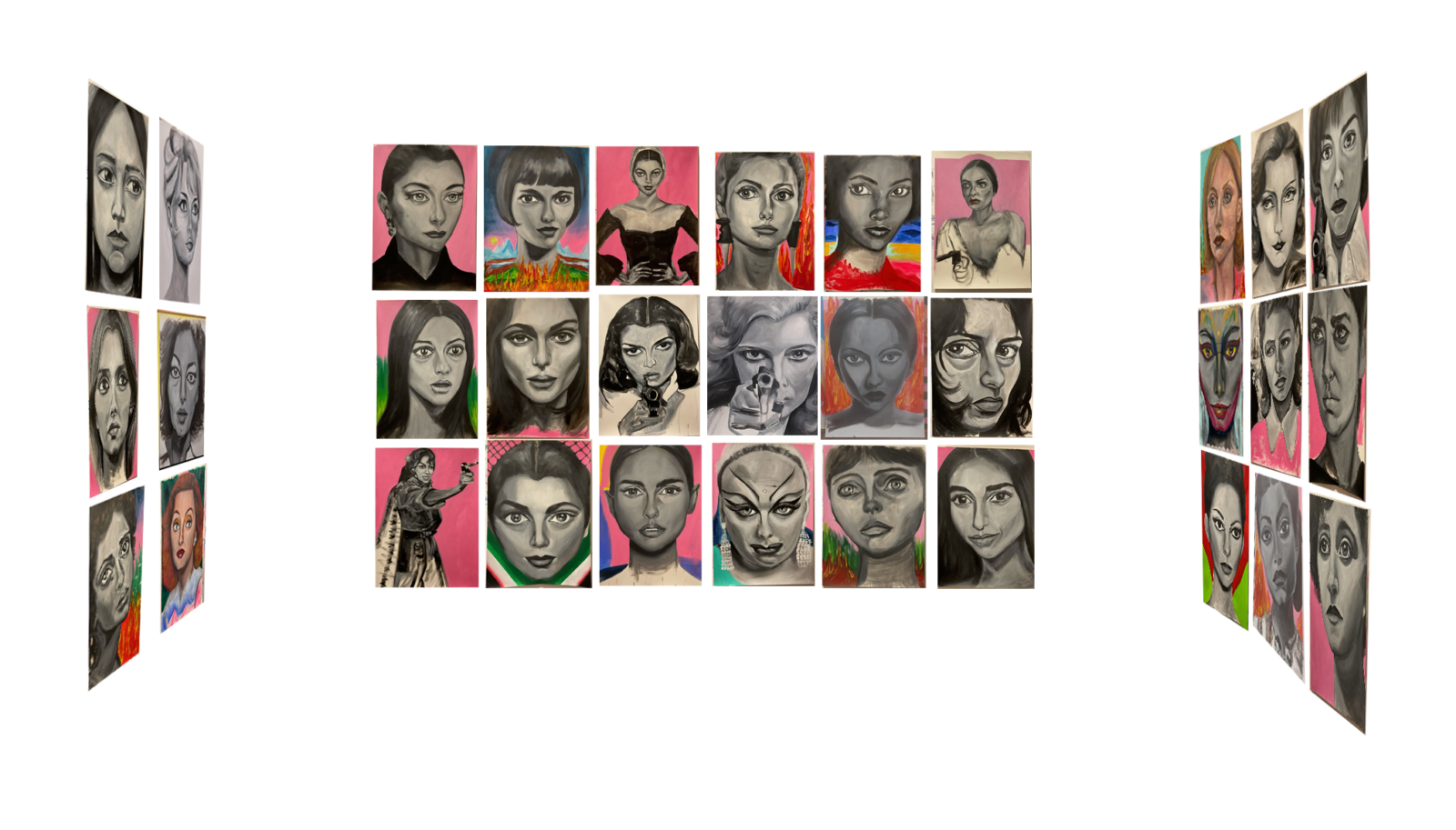 La disposición (rictus, gestos, acción) en que son representadas, captadas de sus fotogramas o la publicidad para la difusión y distribución de las películas en su momento, y varias de ellas con pistola en mano, comparten una posición más que desafiante…(no todas, pero hay un hilo conductor muy vibrante) que nos hace quedar pegados al suelo recorriendo esta suerte de miradas al unísono…, a modo de gran friso romano…, viendo un mural gigante de acrílicos sobre papel entelado cuya dimensión en todos ellos es como las medidas de los carteles clásicos: 70 x 100cm.