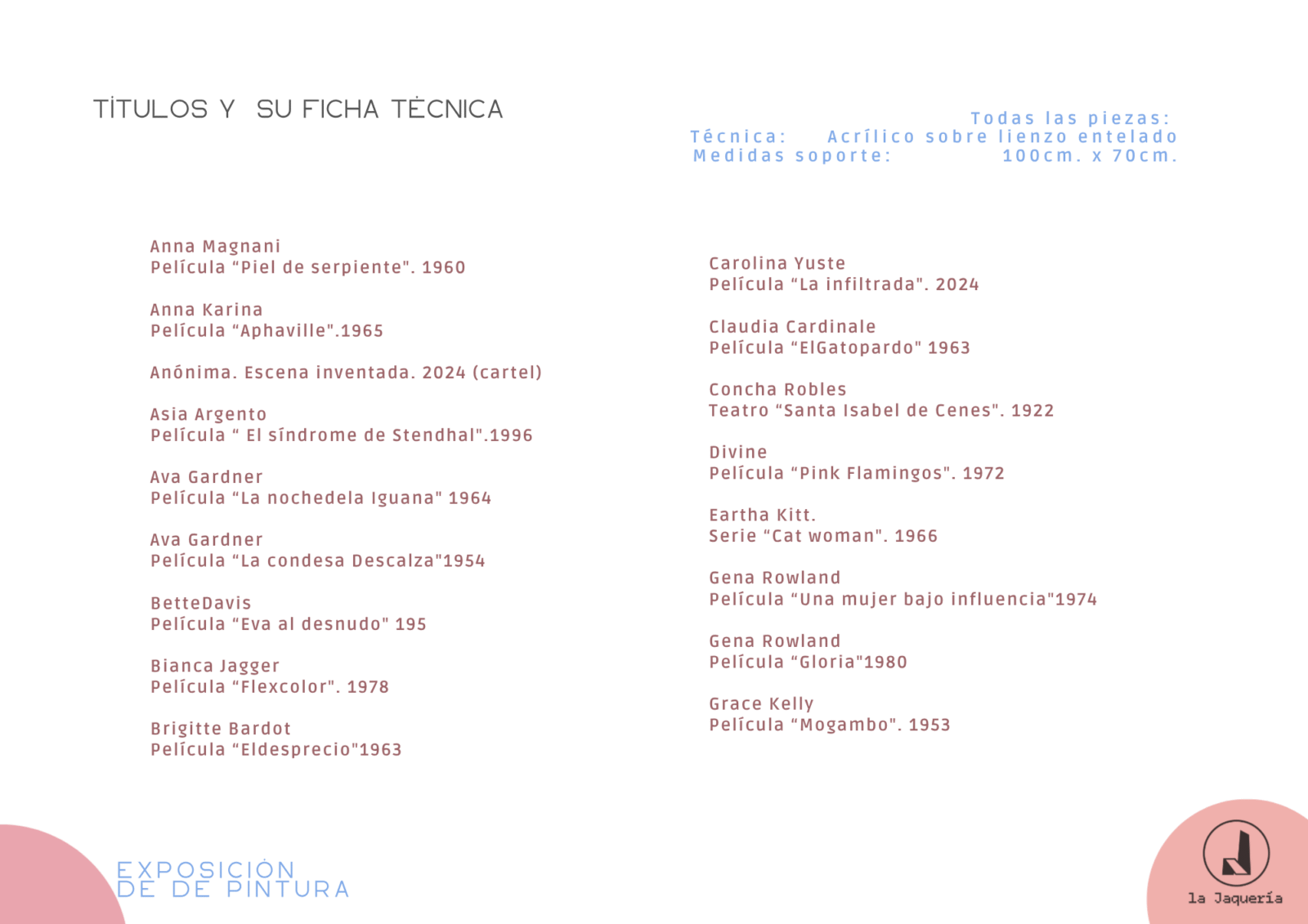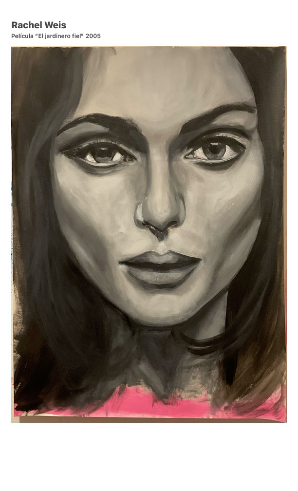 Artificio, realidad, veracidad o verdad…, no tienen aquí cabida, salvo en el referente, repito. Porque Heva no busca calcar, copiar o reproducir la imagen perfecta, icónica, de estas actrices tan populares, Divas, muchas de ellas, en su tiempo y actualmente (eternamente, con toda seguridad para amantes de lo cinematográfico)…, no lo necesita, y hoy día no es necesario… No se trata de ver cuánto se parecen a la actriz en la que se basó para el retrato, aunque el nombre de la película aparece, pero es con motivo de compartirlas…, de unir experiencias cinematográfica remitiéndonos a esa película en concreto que a ella le ha motivado a pintar…